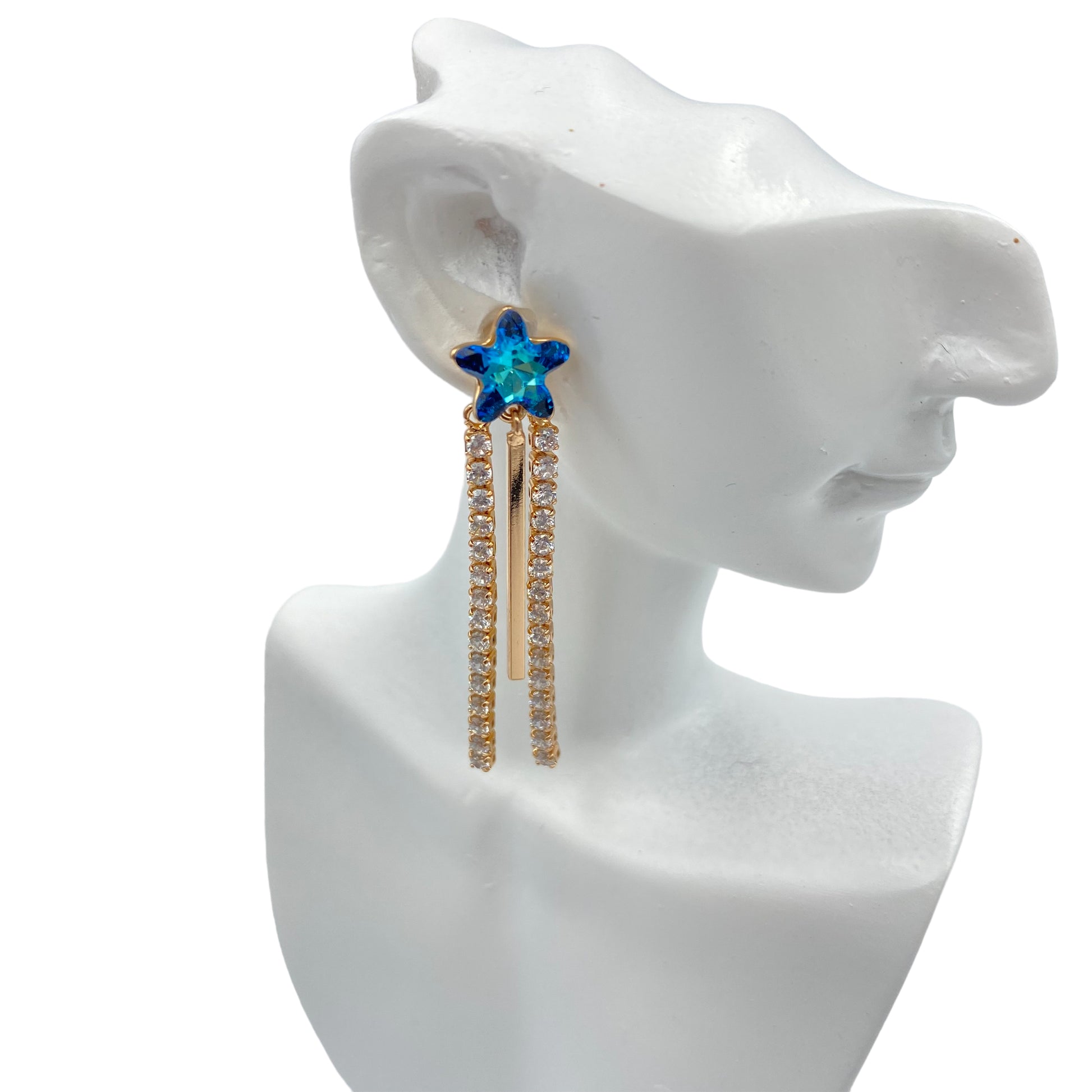 Aretes de alta calidad en color oro con piedras, con estrella en color azul turquesa, elaborados en acero quirúrgico y bañados en oro de 14k